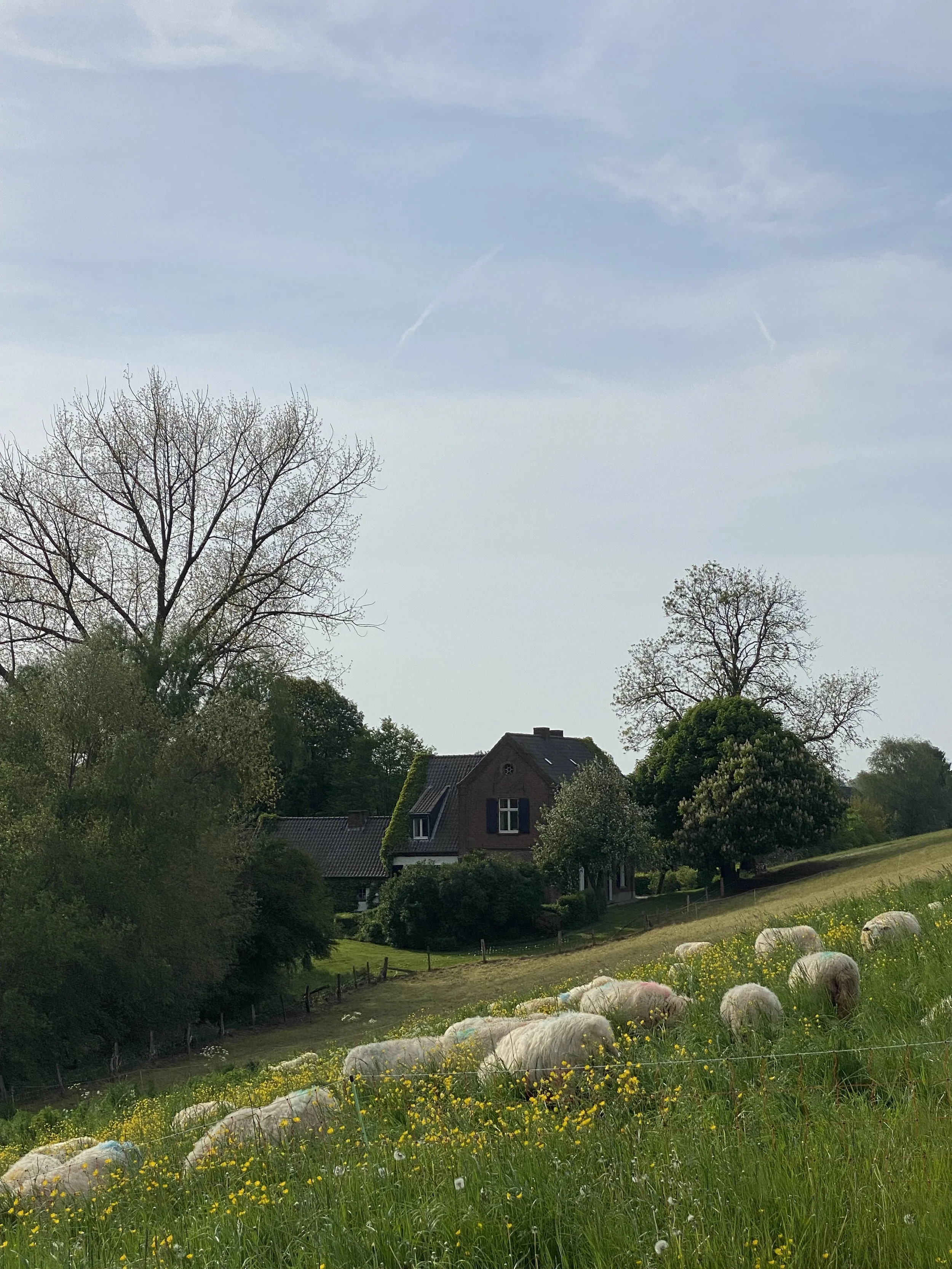 I live within biking distance to the Dutch border and the other week I pedaled over that way along the dyke above the Rhine, and it was the most beautiful thing. (Here is the border in question.)