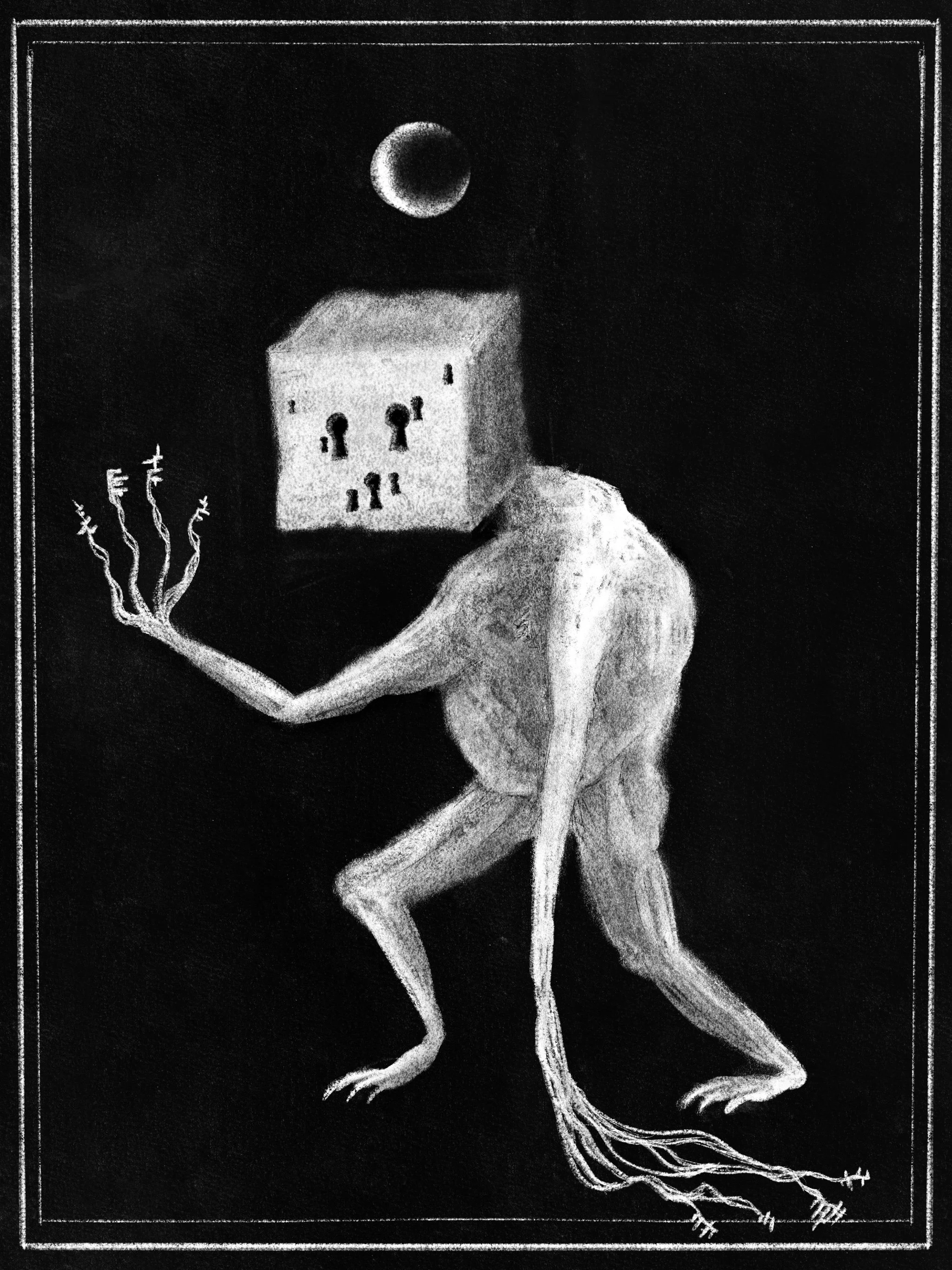 The Key Thing: How strange to see the world through keyholes, though the means to see more is quite literally at this creature’s fingertips. The Key Thing, wanders in dark alleys and quiet lanes, particularly attracted by the promise of glimpsing secrets and overhearing bits of gossip. The creature is very clumsy and loud, and thus ill-adept at discovering anything interesting.